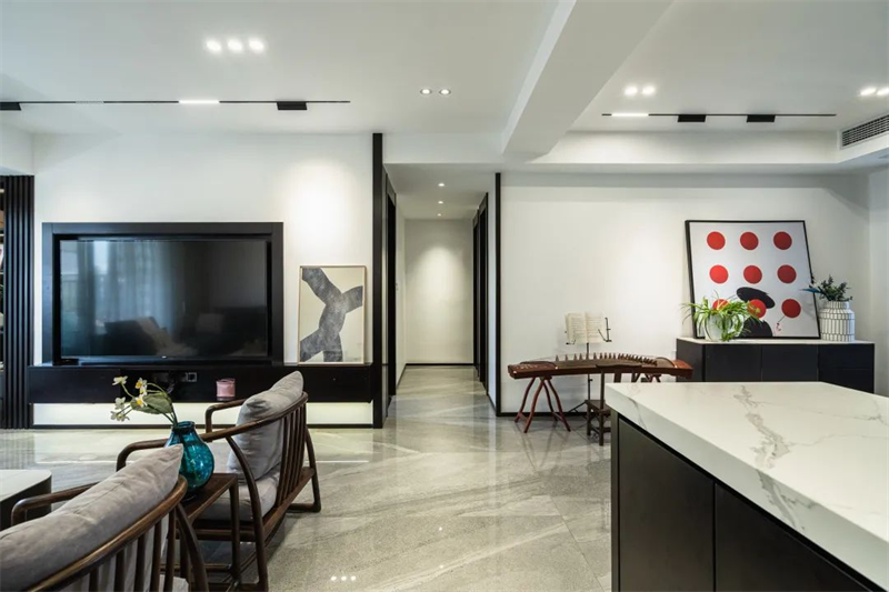 因为露台的原因,新家全屋室内仅有76㎡的使用面积,但她却用巧妙的方式在仅有的空间设计出满足全家人需求的房子。这个“家居放大术” 的秘籍就在饰材的选择上,屋主张女士选用冠珠瓷砖1800×900mm大规格的砂岩深灰岩板进行铺贴,厚重大气的纹理质感,带来不一样的视觉开拓效果,平和的色调治愈心灵,勾勒出淡雅的东方空间。
