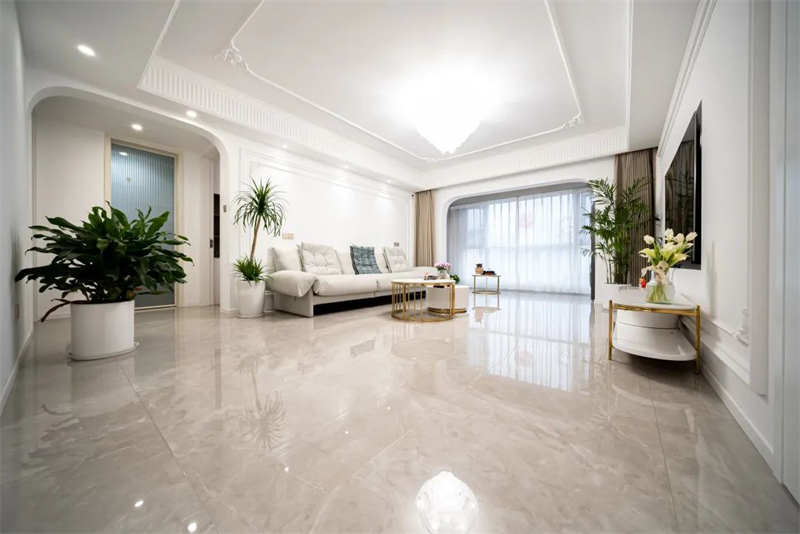 听说每个女孩子心中都有一个公主梦,吴女士和闺蜜也不例外。冠珠瓷砖设计师认真听取意见之后,决定以灰白色作为空间主调,少量金色为点缀,增添视觉层次感。客厅化繁为简,通过细致雕刻、栩栩如生的法式石膏墙,演绎出法式轻奢的韵味。客厅地面瓷砖通铺冠珠瓷砖1500x750mm黄金规格普佩斯灰,灰白色系瓷砖为客厅营造出静谧清心氛围,点缀出法式的优雅气质。