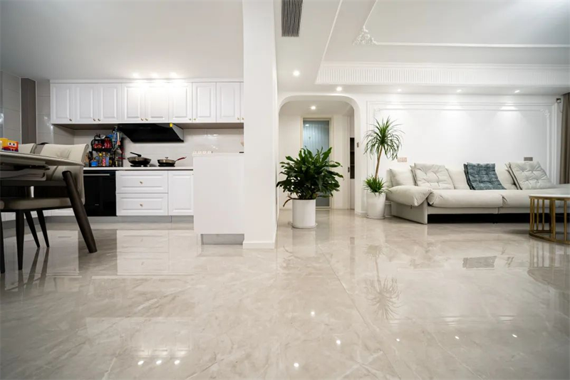 餐厨区地面瓷砖同样采用冠珠1500x750mm黄金规格普佩斯灰铺贴,拉长了空间纵深感;让人惊喜的是,餐厅吊顶是吴女士的点睛之作,寓意名为“月”的月亮形状吊顶,用优雅的弧形边加法式石膏线条勾勒,不仅具备独特性与观赏性,更增加整个空间的立体层次感,呈现优雅的空间浪漫主义氛围。