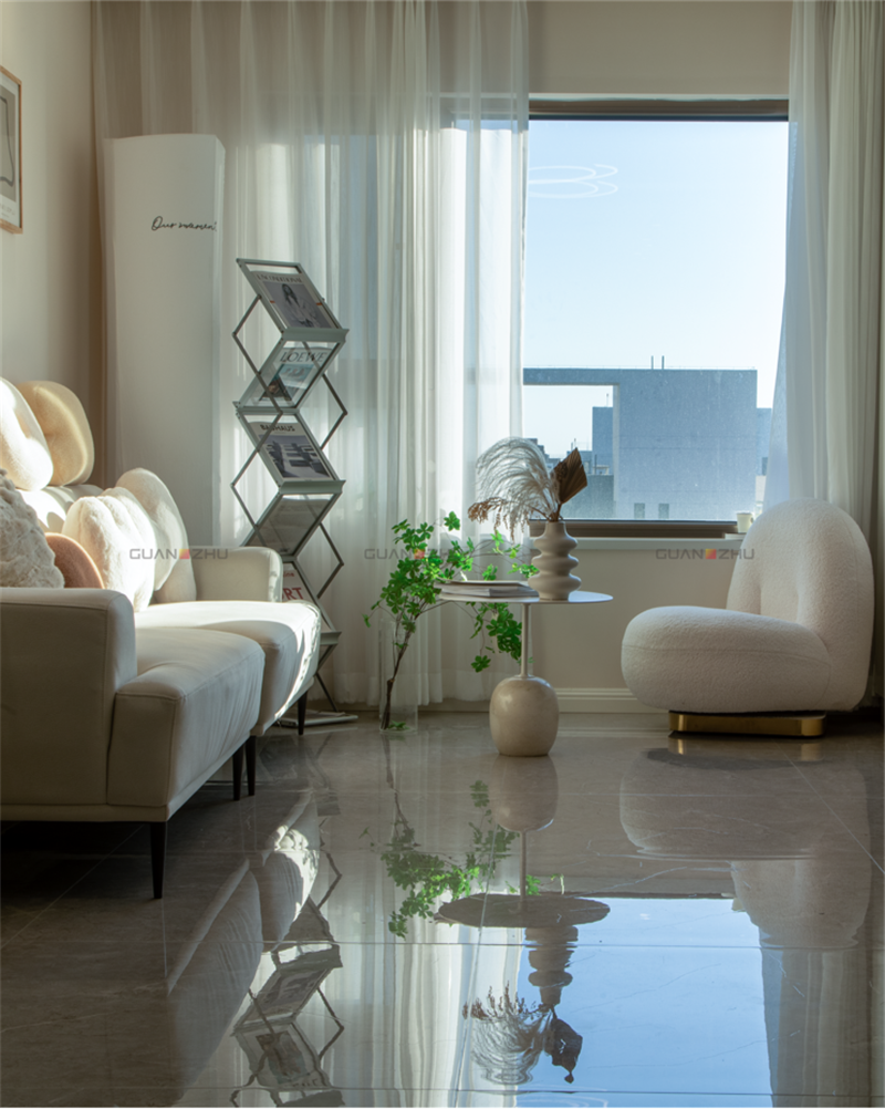 为了保持空间的开阔性,软装一切从简,奶杏色皮质沙发,以及简易置物架,让空间看起来十分轻明亮开阔;客厅地面瓷砖采用浅色的冠珠凯罗地瓷砖,表面清爽明亮,致密性高,更防污耐磨,长时间使用也能光洁如新,在很大程度上减轻了清洁负担。