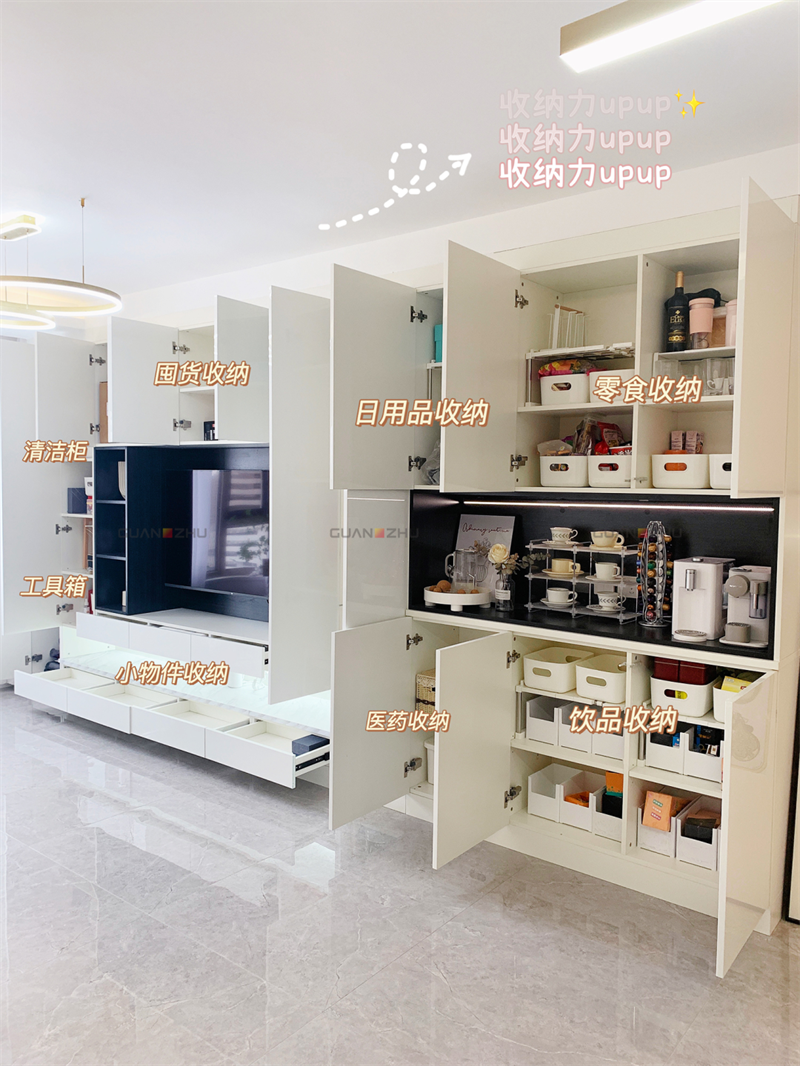 温馨、温暖一直是屋主夫妻心目中理想的颜值,客厅以低饱和度的奶油色搭配米白色,打造一个温馨十足的空间,“流心芝士奶黄包”,是屋主给客厅取的非常形象贴切的名字。