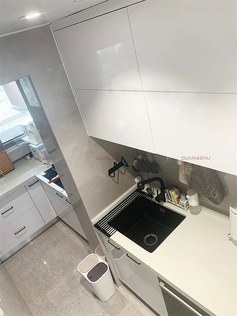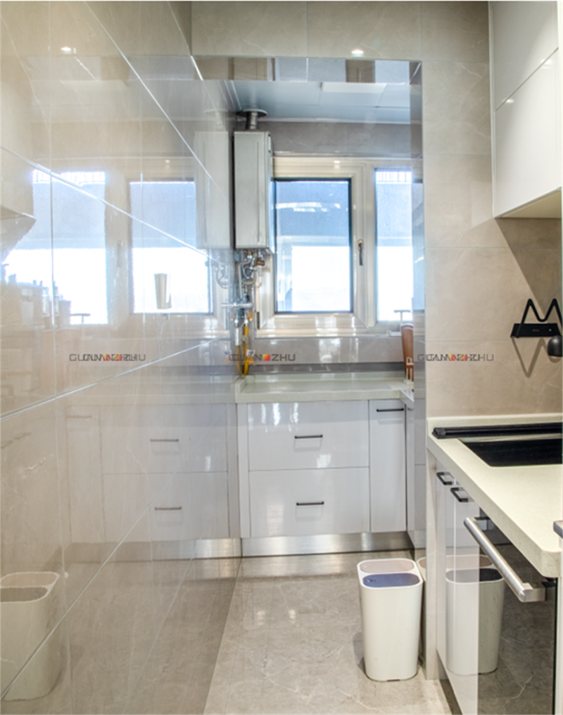 “麻雀虽小,五脏俱全”是对厨房最好的形容,L型厨房动线合理,洗切煮动线合理;柜台设计符合人体工程学,做饭更享受;一切物品尽可能上墙,节省空间。厨房瓷砖铺贴浅色系冠珠凯罗地瓷砖相互搭配,在视觉上扩大了空间范围。