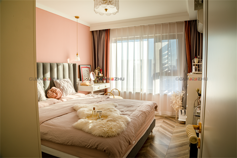主卧整体以浅粉为基调,没有复杂的硬装,也没有豪华的家具,13㎡的主卧,承载了屋主满满的少女心。整体用灰粉色做搭配,低饱和度带点灰调更高级。大量的奶茶色让卧室更加温柔。