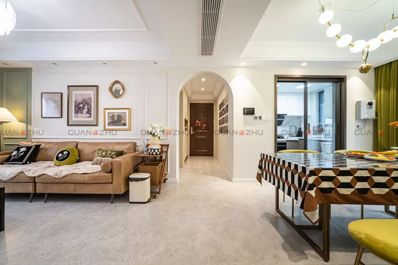而在大面积的地板选材上,许多人都觉得木地板是法式风装修的标志,但邹女士觉得用哑光砖会更具质感,因此选用了规格1200×600mm的冠珠迪拜灰作为客厅瓷砖,这种地砖材质不但更适合铺设地暖,而且饰材性能也十分优越。高级灰的地砖色调,让整个空间显得更加温馨柔和。