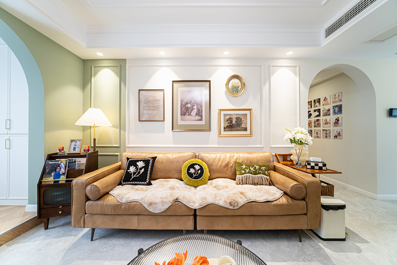 在客厅的色调设计上,邹女士选用了绿色墙面点缀,这是大自然的颜色,给人镇静疗愈的感觉,同时又象征着新生命与希望,代表着医者仁心的男主人。在客厅大沙发等家具上,则选择了棕色的主色调,绿+棕就像森林配大地,呈现出岁月静好的清新自然之美。