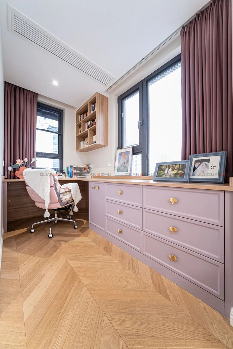 值得一提的是,主卧里还有一处边角位空间,邹女士巧妙地将其设计成了一个富有创意的转角书房,让丈夫在业余时间能够有一处学习研究的静心之地,充分利用起了这一方寸空间。每一处细节的精心设计,都透露出邹女士对家人的温柔和爱意。