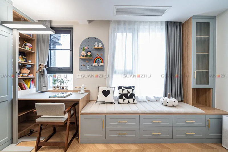 在空间布局上,邹女士也没有完全走低幼路线,而是进行了一步到位合理规划,打造了一个成长系的儿童房,其中设计了大面积的储物空间,如收纳柜、洞洞板等,飘窗也设计成为卡座,底部能储物,能够满足孩子成长过程中东西越来越多的收纳需求。