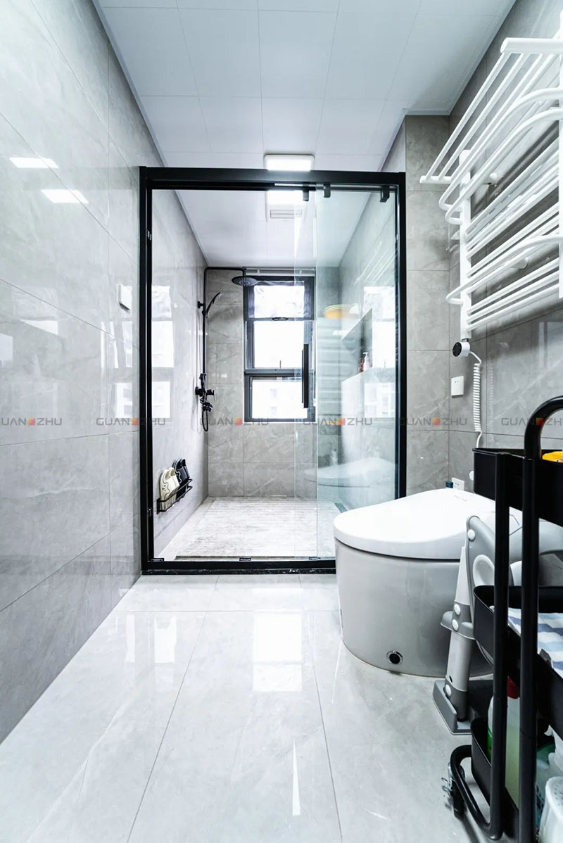 在卫浴间,邹女士则采用了规格800×400mm的冠珠普佩斯作为卫生间瓷砖进行通铺,从视觉上延伸空间感,灰色高级又耐脏,也更加符合浴室冷静的气质。