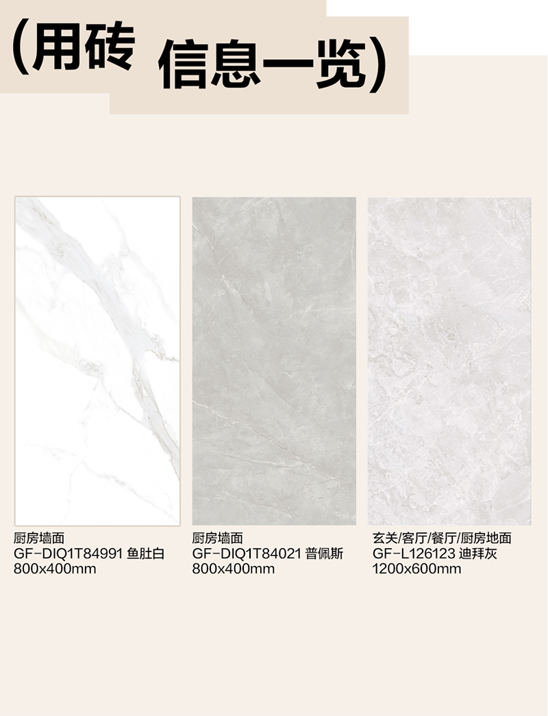 而在餐厨区与卫浴空间上,邹女士选用了白色与灰色作为主色调。例如厨房选择了与客厅同色系的冠珠迪拜灰瓷砖大面积通铺,呈现出一体化设计,厨房墙面岩板则选用了规格为800×400mm的冠珠鱼肚白瓷砖,墙地都铺设瓷砖,即便沾上油渍、水渍,也很容易清理。