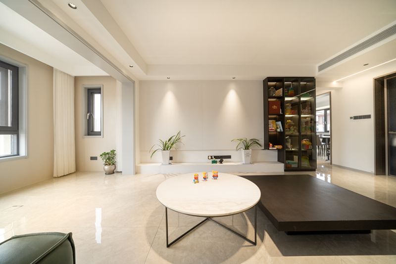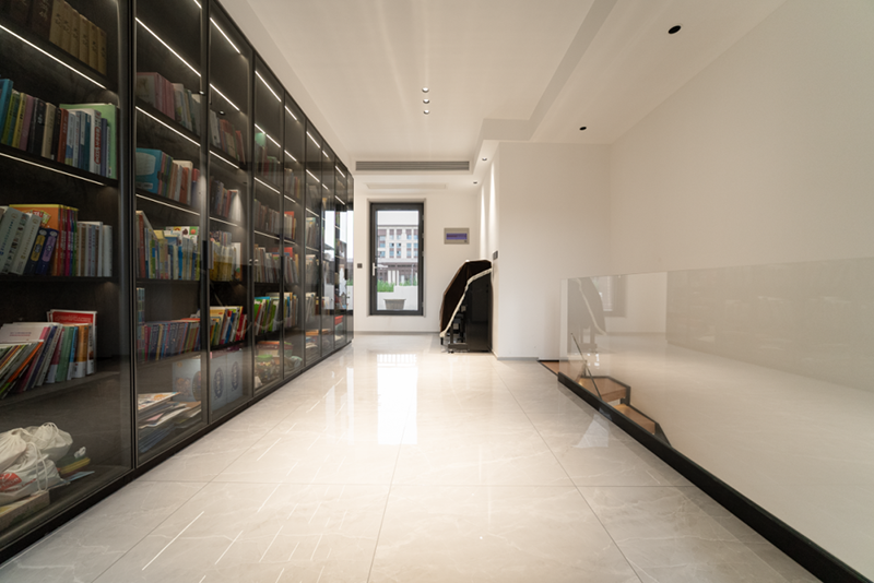 来到房屋二层,这里则是“小家庭”的独立空间。二层客厅处一面到顶的黑色系书柜是屋主陈女士的得意之作,可以很好地收纳起孩子们的绘本、玩具及其他杂物。再搭配地面上的冠珠劳伦白金瓷砖,在黑与灰的简洁色调映衬下,整个空间都更加高级大气。