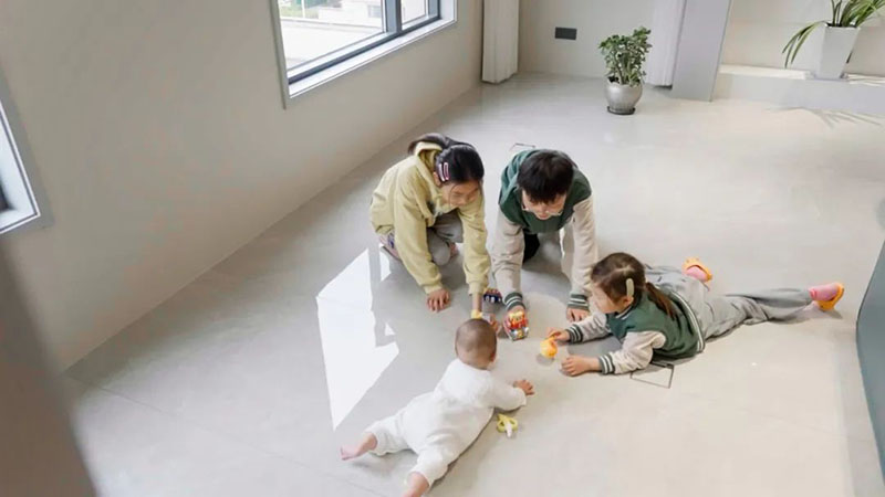 面对这样一个大家庭,房子在装修时需要结合三代人的不同需求,更多地考虑平衡性和包容性,最终定下的便是干净纯粹的现代极简风装修。而想要将不同的区域自然兼容,地砖的选择是重中之重,这也是屋主陈女士最花心思的版块。据陈女士介绍,当初其和丈夫一起逛了很多瓷砖店,适合极简风装修的灰色系瓷砖非常多,最后选择的是冠珠瓷砖,不仅符合审美,而且大品牌更令人放心。