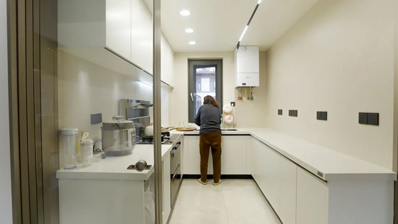 厨房则是屋主陈女士她妈妈经常出入的地方,在装修设计上也尊重了妈妈的想法。本来陈女士想要在厨房墙面做吊柜,但是厨房空间不大,她妈妈觉得全是柜子会很压抑,所以最后在墙面选择了冠珠星悦石-象牙白瓷砖,白色系的瓷砖不仅放大了视觉效果,还增加了空间呼吸感。