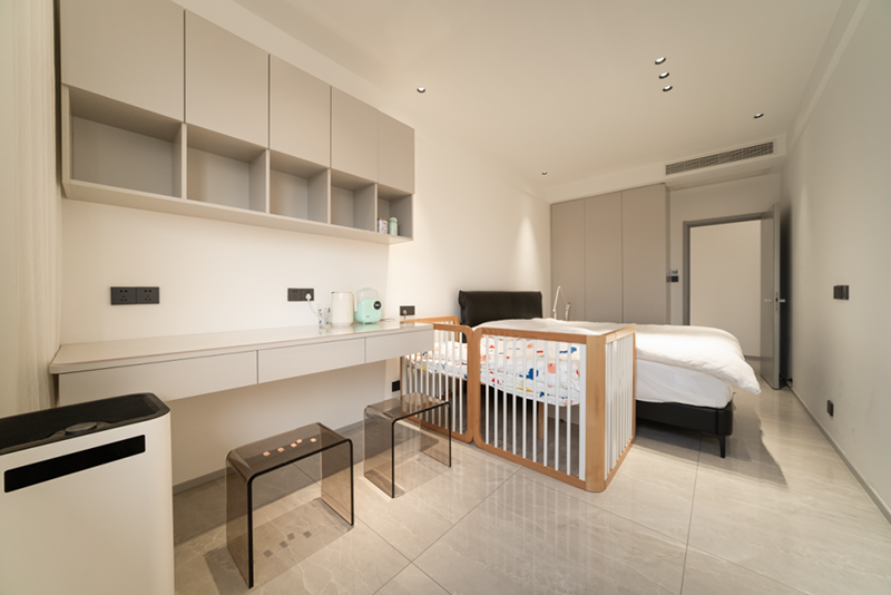 卧室处同样沿用了简洁大气的冠珠劳伦白金瓷砖,低饱和度的灰色系能够营造更舒缓温馨的休憩环境,置身于这样的洁净空间内,身心都能快速放松下来。
